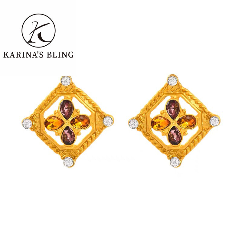 Karina's Bling Four Petal Rhinestone Flower Earrings with Silver Needle Anti-allergy Alloy Exaggerate Jewelry.